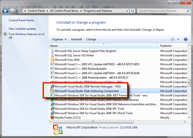 Fortunately this issue is easy to fix. This component shows up in “Programs and Settings” as “Microsoft Visual Studio Web Authoring Component”.