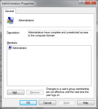 For example, my main system—which is not joined to a domain—has only the Administrator in the Administrators group. (Be sure to create yourself an administrator account before removing your main account from Administrators or you will lock yourself out of your machine.)