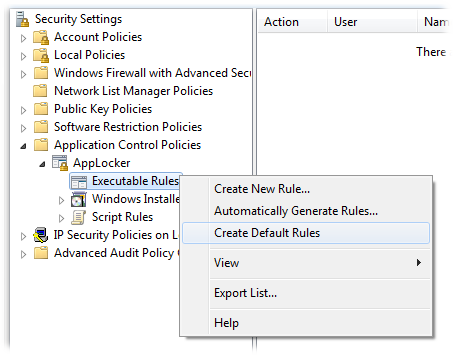 Navigate to Security Settings | Application Control Policies | AppLocker | Executable Rules. Right-click on Create Default Rules. AppLocker will generate the reasonable set of defaults that I described above.