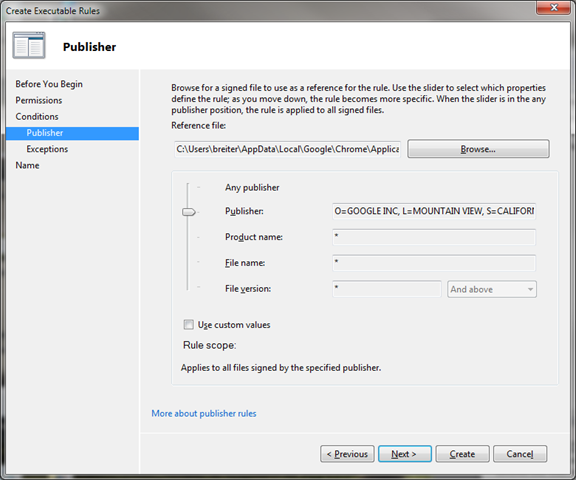 After selecting Chrome.exe, slide the selector up to Publisher and click next until you are allowed to choose create.