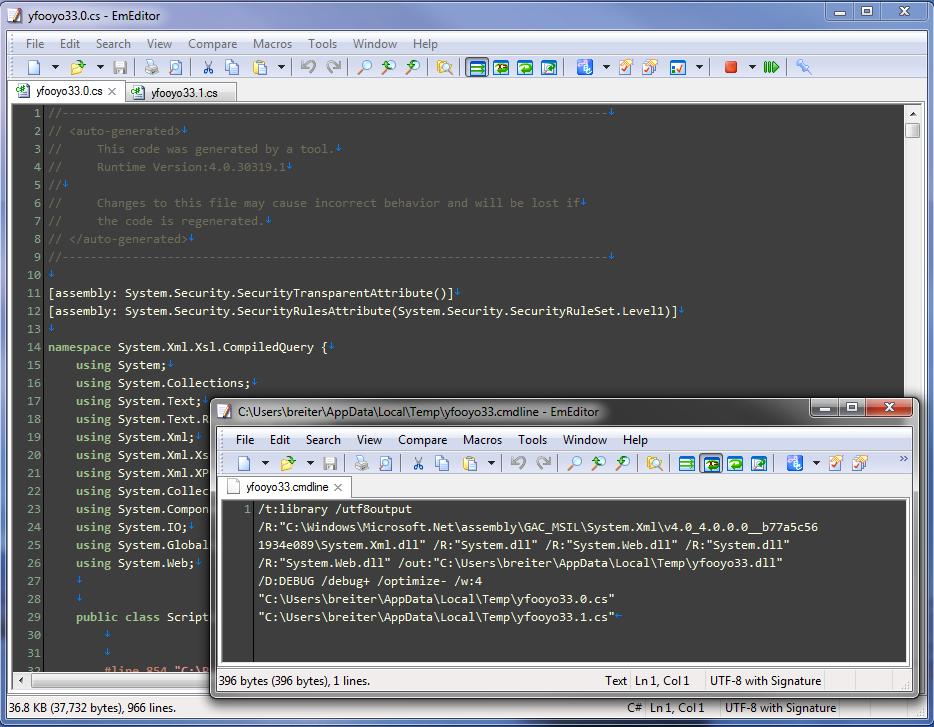 I’m not sure why it does this but HelpLibAgent.exe generates a random string and then two .cs files based on that string and invokes the C# compiler to generate a DLL based on the random string which is dynamically loaded by HelpLibAgent. This seems weird on the face of it that and there’s nothing in that code that looks like it has to be generated on a per-user basis at all. Weird, weird, weird.
