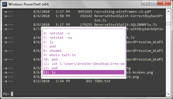 Console.sf.net with muted colors showing F7 history popup.