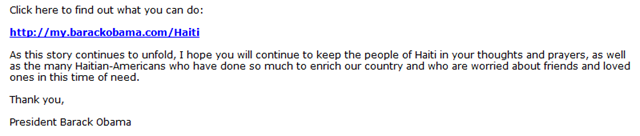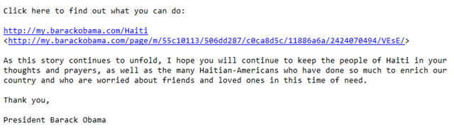 The text “http://my.barackobama.com/Haiti” is actually linked to some obscure URL at my.barackobama.com. This URL probably encodes information about the page to display as well as my identity. It is almost certainly there so that the people running my.barackobama.com can track my behavior if I were to click this link.